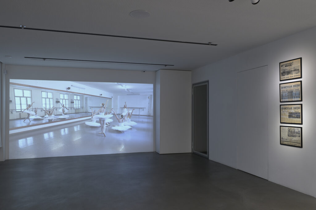Anna Jermolaewa and Oksana Serheieva, Rehearsal for Swan Lake, 2024, video 4k (180 min.), ballet barre, mirror, performance